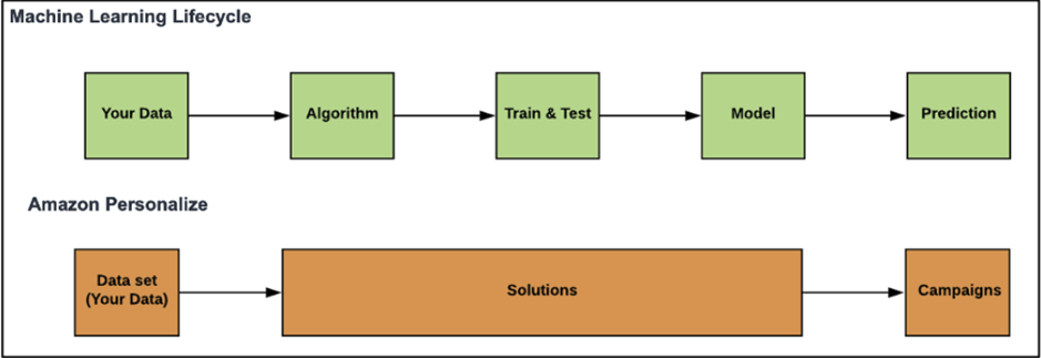Amazon Personalize, on the other hand, streamlines this entire lifecycle. You simply provide your dataset and Personalize takes care of the rest by handling the training pipeline, optimizing algorithms, and serving real-time predictions through scalable campaigns.